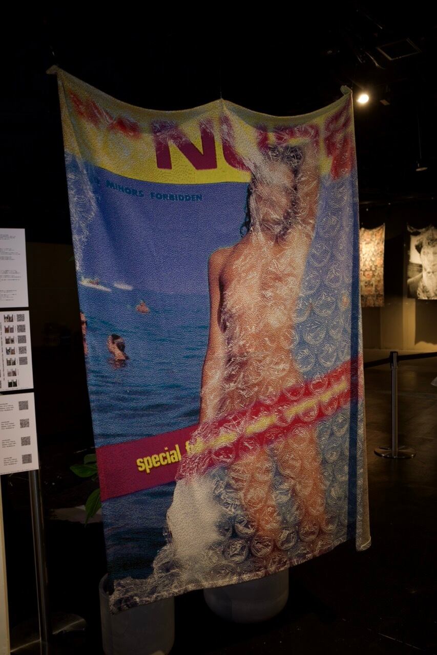 ビンテージのヌード雑誌をモチーフに、視覚の距離感と解像度に着目した作品。誰もが知るバブルラップを用い、6色の編み目によって構成された像に焦点を合わせることで、曖昧さと明晰さの境界を問いかける。近づくほどに失われ、離れるほどに立ち上がる全体像が、見るという行為そのものを再考させる。